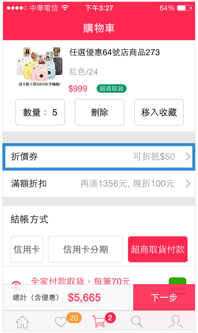 1. 購物車:登入會員後進入購物車,系統會自動帶入會員已領取的折價券。