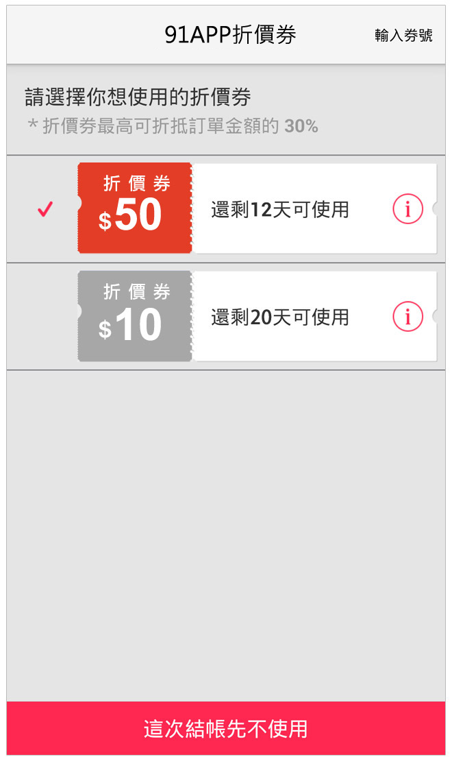 2. 折價券清單:若會員有同一間商店2張以上折價券時,會自動優先選擇即將到期之折價券,會員仍可選擇使用其他張折價券。