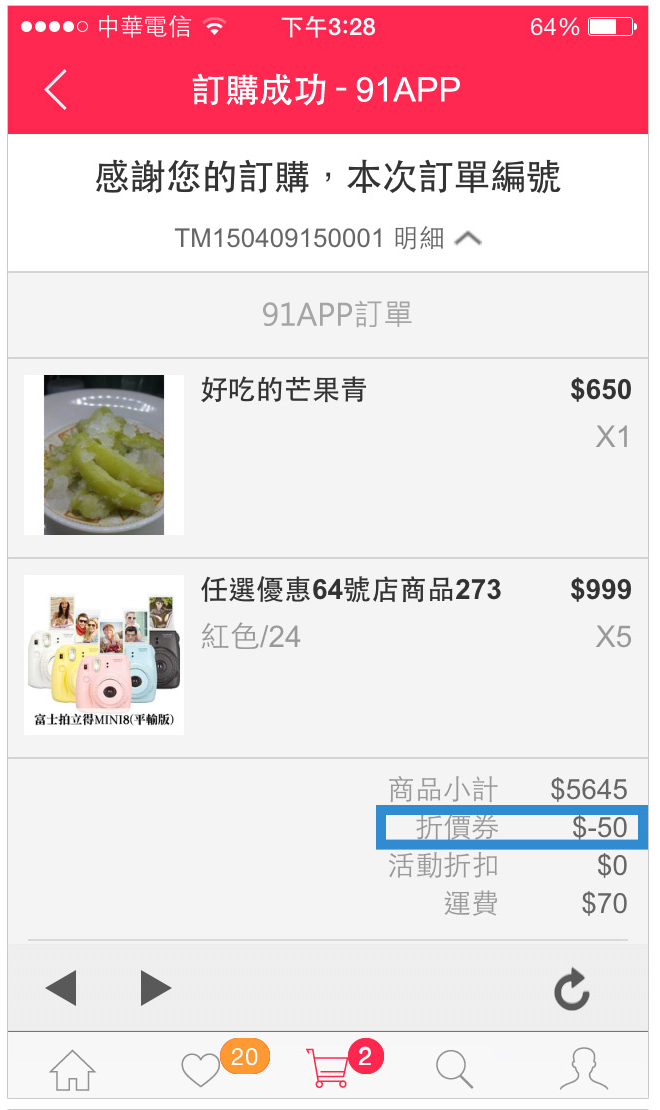 3. 訂購完成: 訂單顯示折價券折抵資訊。